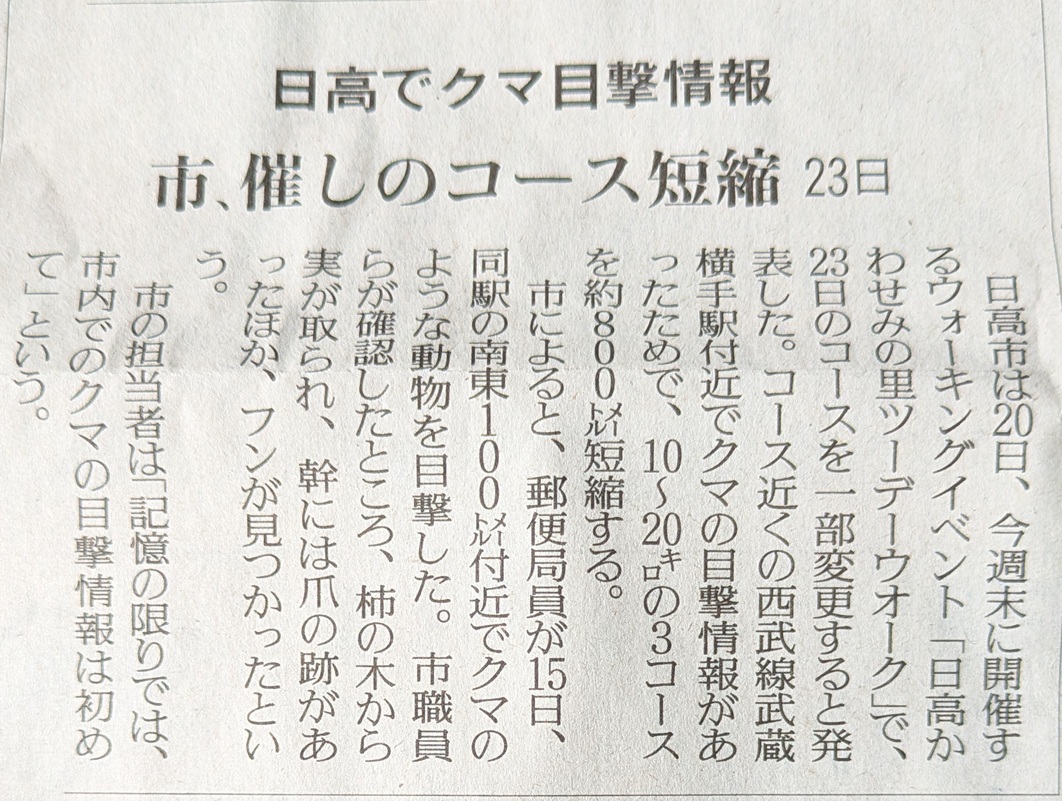 日高の予定コースの近くで熊の目撃情報があり、コース変更(当日発表)があるとのことです。 以下は読売新聞21日(朝刊)記事です。 |