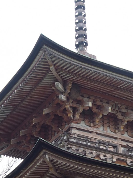 | 埼玉県指定文化財でもある三重塔。数年前から3階部分に大きなハチの巣があります。 |
