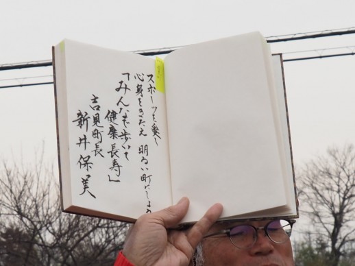 | 昼食・表彰は吉見町長谷工業団地入口にある八幡神社にて。吉見町長新井保美氏からのサイン帳を披露。 |