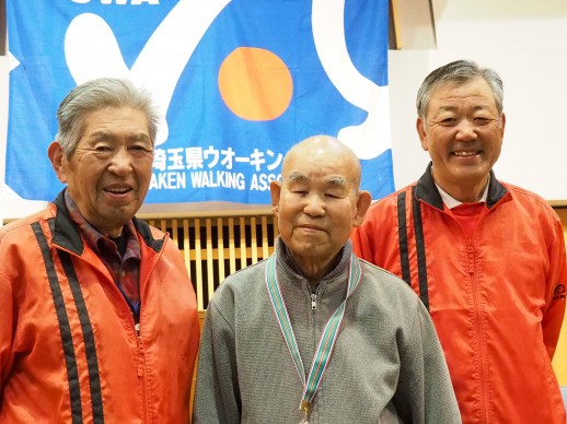 | SWA会員最高齢の小林さん(94歳)をはじめ、出席された延89名の元気なウォーカーの皆さんの表彰を行いました。おめでとうございます! (写真左から、小川名誉会長・小林さん・神山会長) |