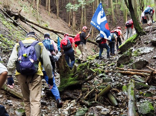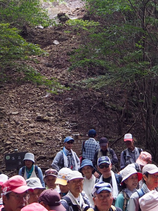 | 伊豆ヶ岳山頂直下、時間の関係で標高770m地点で折り返します。正面の急坂は現在歩行禁止の男坂。 |