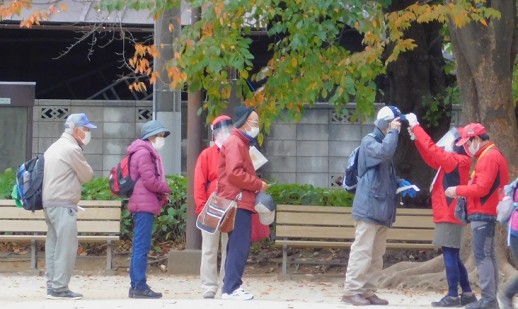 体温チェックを欠かさずに、みんな元気にウオーキングへ出発。密にならないように気を付けましょう。
